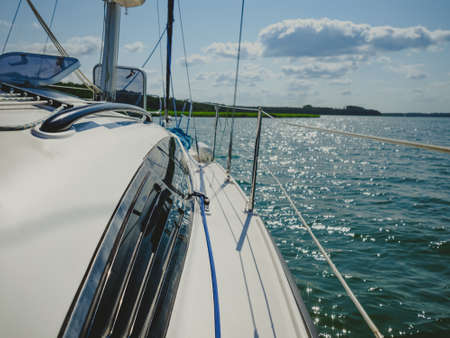 White yacht sailing in a still water at sunset. A view from the deck to the bow, mast, sails. Stunning cloudscape. Reflections on water. Baltic sea. Lifestyle, cruise, regatta, sport, recreation