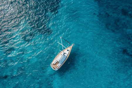 Serene aerial view of a sailboat anchored on flat calm seas during early morning light, showcasing tranquility and natural beauty in open waters