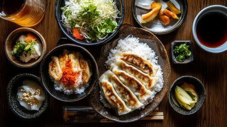 A sumptuous Japanese meal featuring gyoza served with rice, fresh vegetables, and a variety of sides. Ideal for showcasing authentic Asian cuisine.