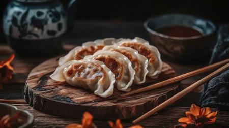 Savor the sight of perfectly cooked gyoza dumplings on a rustic wooden platter, complemented by fresh greens and a dipping sauce, ideal for a delightful dining experience.