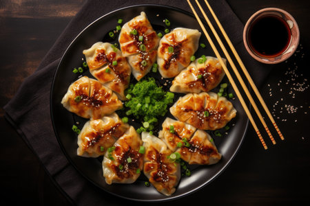 Savor a plate of delicious dumplings, perfectly grilled and served with chopsticks. The inviting presentation and vibrant flavors make this dish irresistible.
