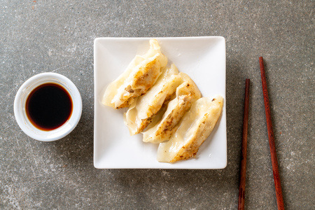 Isolated Top view of Yaki-Gyoza set (Japanese Pan-Fried Dumplings) served on white plate.