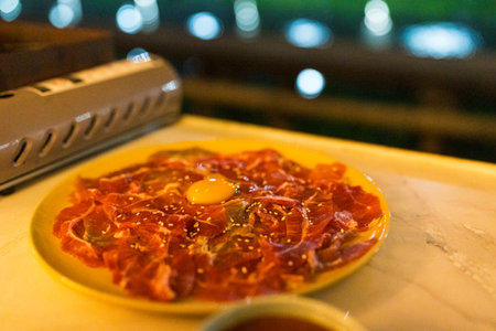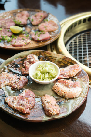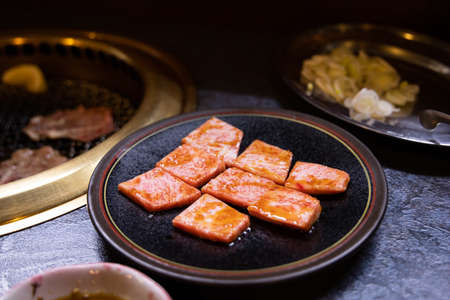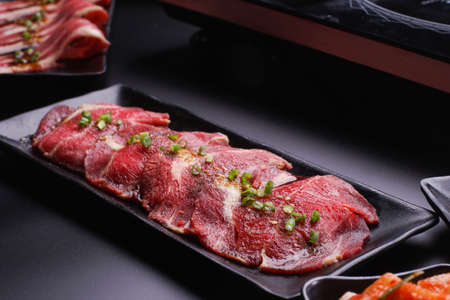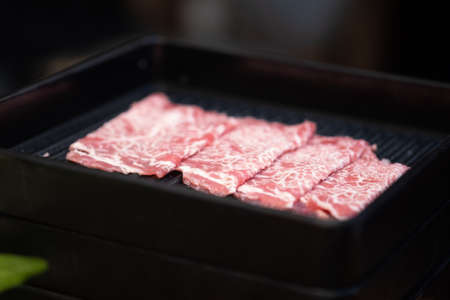 Raw beef slice for barbecue japanese style, yakiniku, meat are being cooked on stove in Japanese restaurant.