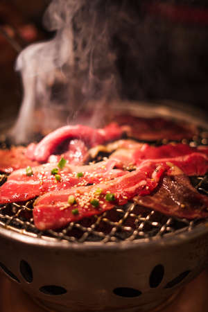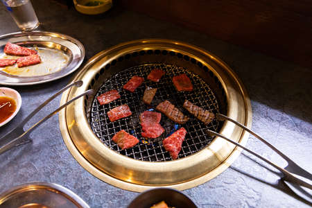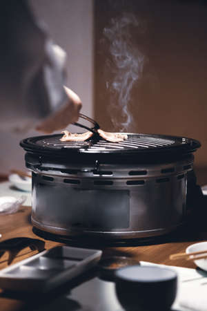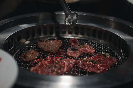 Korean beef barbecue on hot coals. Grilling meat pork Korean BBQ traditional style on stove serve in restaurant, Japanese food