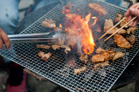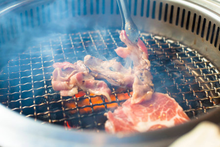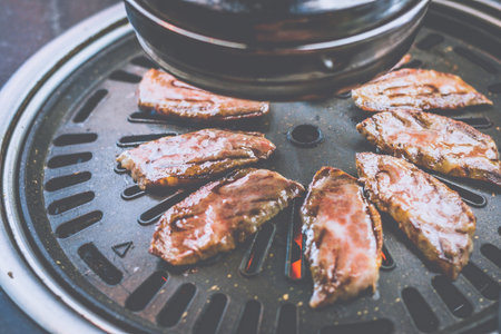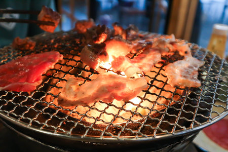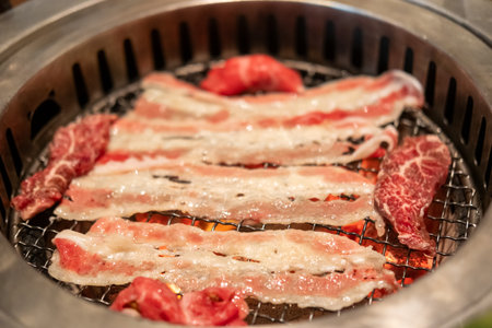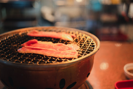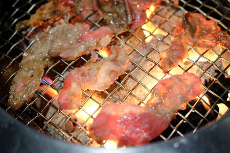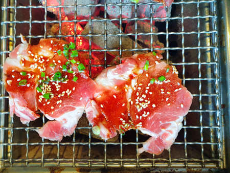 Sizzling pork slices grill on charcoal, Korean or Japanese BBQ style cuisine.