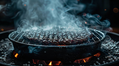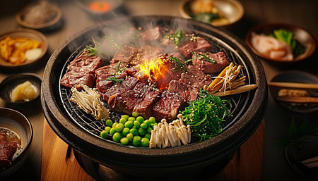 A Korean BBQ experience with diners grilling meat at the table, enjoying the sizzle and aroma of the food