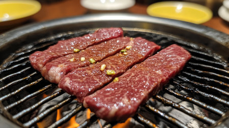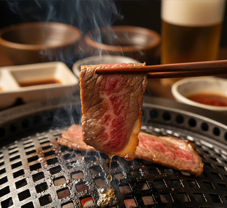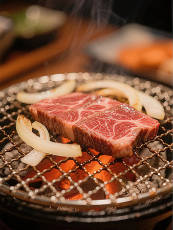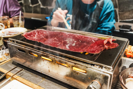 Authentic yakiniku barbecue experience in Tokyo, Japan. Thinly sliced beef grilling on a hot plate with garlic and onions. Smoky, flavorful aroma and vibrant Japanese dining atmosphere.