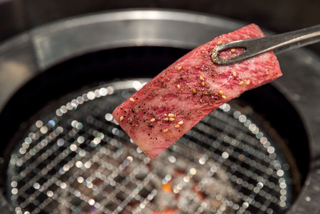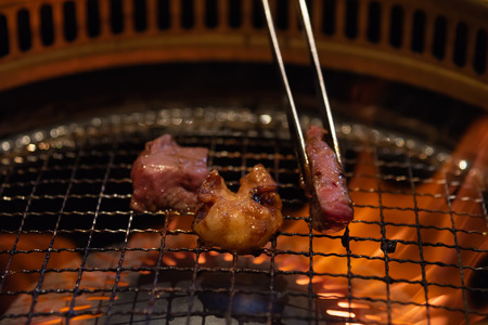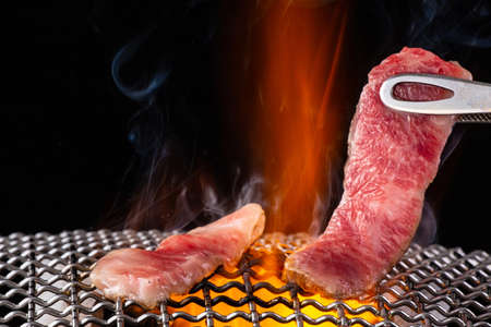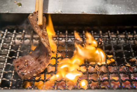 Pieces of marinated raw beef were put on grill with flame under the grill. Delicious food in Japan,