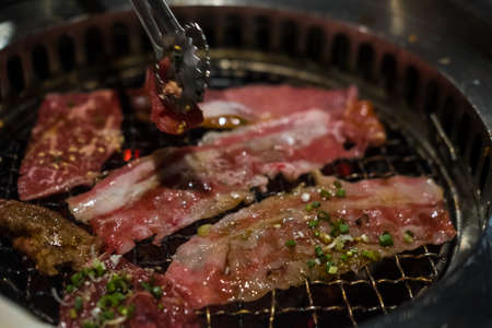 Close up eating Yakiniku raw beef grilled over charcoal, Yakiniku is a dish of thinly sliced beef cooking in grilled