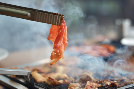 Close-up of meat grilling on a Korean style barbecue grill with tongs