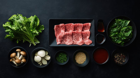 A minimalist table setup featuring fresh ingredients for Shabu Shabu. Enjoy the vibrant colors and textures of beef, vegetables, and sauces. Perfect for cooking enthusiasts.