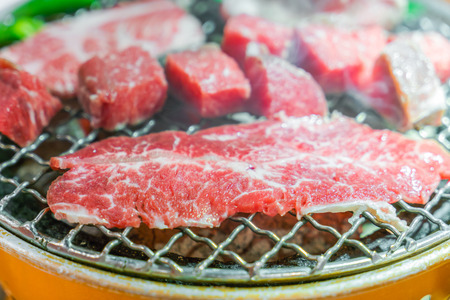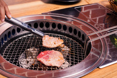 Grilled raw meat beef and pork (barbeque, bbq) a food cooking on wagyu grill in BBQ. yakiniku grill buffet restaurant