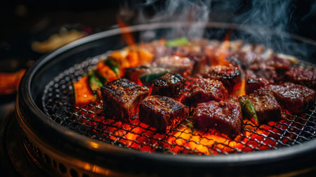 Experience the mouthwatering appeal of grilled meat on a charcoal grill. The smoke dances around colorful vegetables, creating a warm and inviting culinary scene.