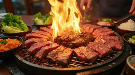 A close-up shot of a table setting featuring a sizzling hot plate of grilled meat, Korean BBQ style. The meat is arranged neatly on a grill with side dishes like kimchi and other sauces.