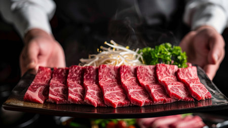 A chef presenting a platter of premium wagyu beef for shabu-shabu, with marbled slices arranged beautifully for a luxurious dining experience.