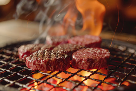 Juicy beef slices grilling over an open flame create a flavorful and aromatic experience in the kitchen. Perfect for a hearty meal or special occasion.