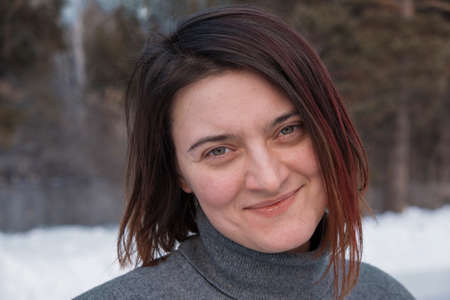 portrait of a smiling woman in profile. The face is covered with hair. No makeup in winter, red cheeks