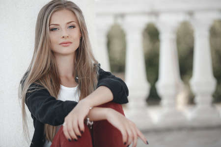 Stylish beautiful smiling attractive woman with long straight hair, blonde with blue eyes, wearing a black jacket and brown jeans, posing alone outdoors, relaxing sitting on a city street in summer