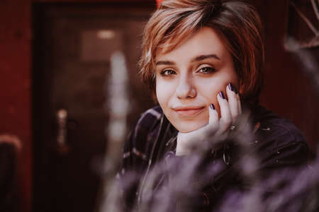 Outdoor portrait of young beautiful woman with short red hair posing with lavender flower. City lifestyle. Girl in the old city with red walls
