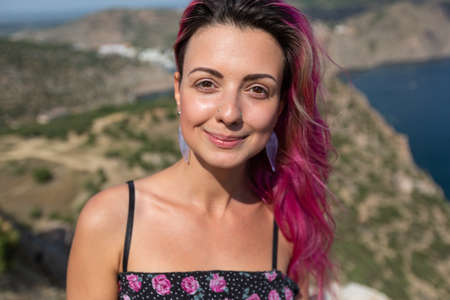 Bright girl with pink hair stands in a mountainous area against the background of a beautiful sea view smiles and looks into the camera. Happy life. Rest at sea. High quality photo