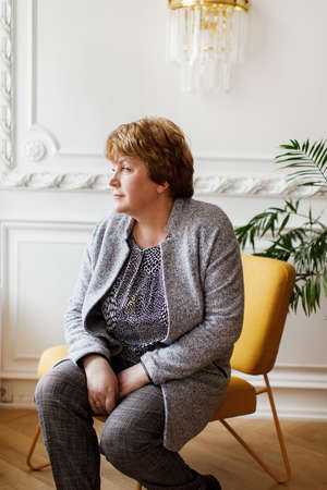 Elderly woman sits on a yellow chair in the interior at home