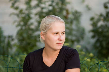 Portrait of smiling young middle aged white caucasian girl woman with short hair stylish haircut in t-shirt looking away outside in summer park