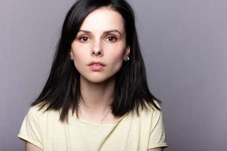 Portrait of tipical thoughtful teenager girl with dark long hair in yellow t-shirt on the grey background