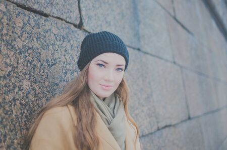 beautiful girl on the background of the stone walls.