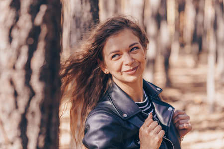 Close up of attractive young woman posing in wood. Charming female photographed on camera, standing in forest.