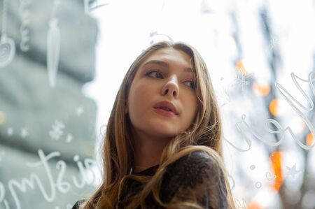 Girl walking in Christmas traditional market decorated with holiday lights in the evening. Winter portrait beautiful young woman outdoors in front of Xmas holidays decorations.