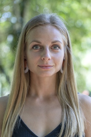 Beautiful caucasian blonde girl in nature background. A portrait of a young woman in tropical garden, Thailand, close up
