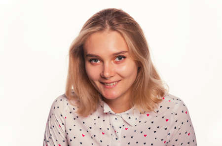A beautiful young woman with long straight hair and brown eyes, a blonde with a pleasant smile, long black eyelashes dressed in a blue and white blouse, posing in the studio on a gray-blue background