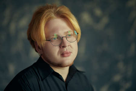 A young plump man with red hair wearing a black shirt and glasses stands thoughtfully looking away. Studio shot. Modern young man.