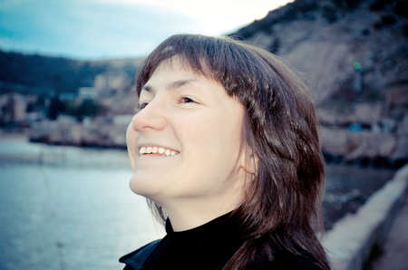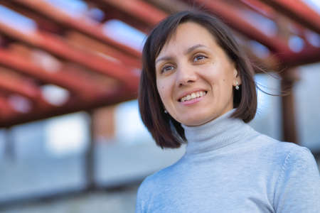 portrait of smiling woman face on blurred background.