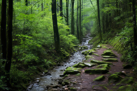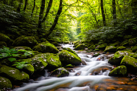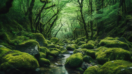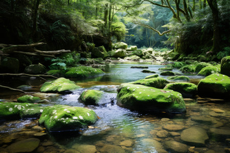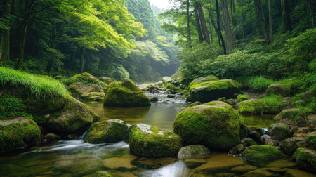 Serene forest river flows gently through moss covered boulders, surrounded by lush greenery and tall trees, creating tranquil and peaceful atmosphere in nature