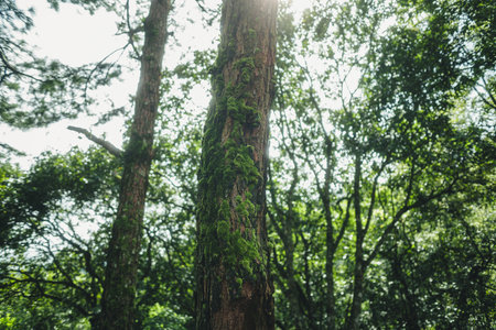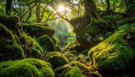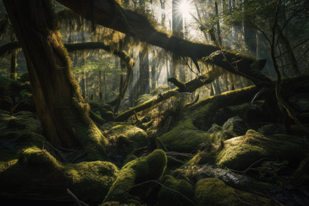 moss-covered tree trunk surrounded by sunlight filtering through the forest canopy, created with generative ai