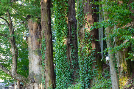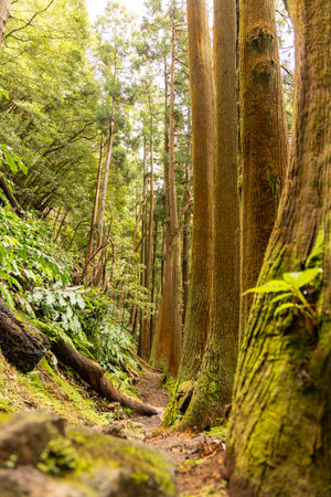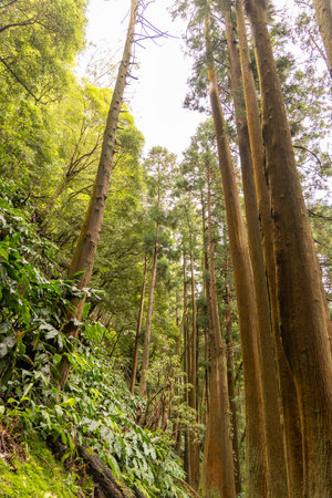A cryptomeria japonica Japanese cedar forest with many trees and some bushes. The trees are tall and green.