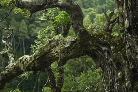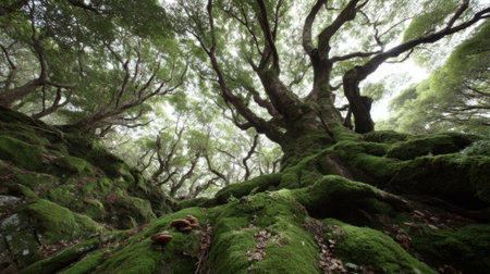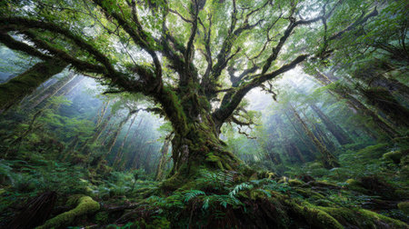 Majestic gnarled tree with twisted branches and lush green moss dominates a misty forest landscape surrounded by rocky outcrops and foliage under soft light