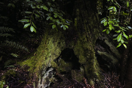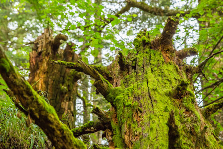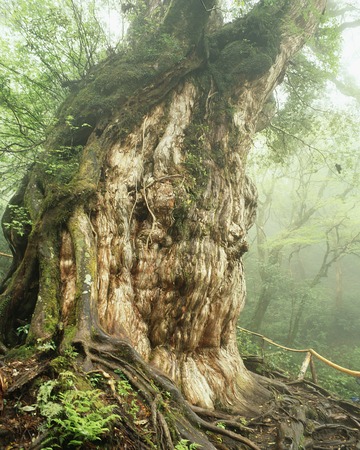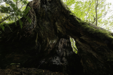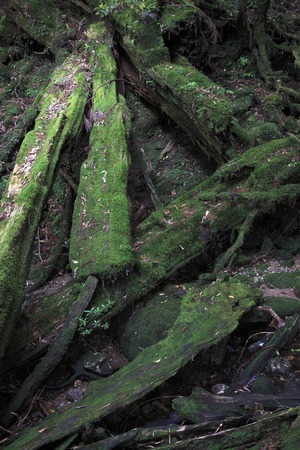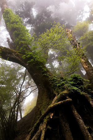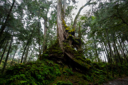 Close up of giant root of long live pine trees with moss in the forest in Alishan National Forest Recreation Area in Chiayi County, Alishan Township, Taiwan.