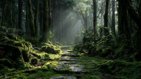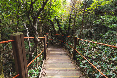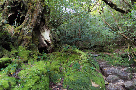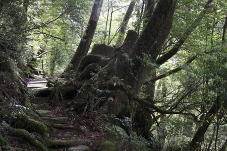 A path through lush rainforest on the southern island of Yakushima (屋久島), Japan.