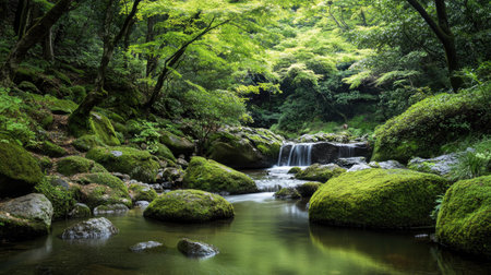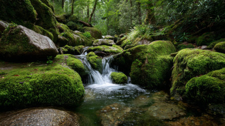 A serene view of a tranquil stream flowing over moss-covered rocks, surrounded by lush greenery, highlighting the beauty and tranquility of nature's untouched wilderness.