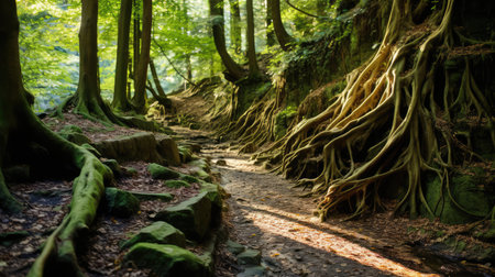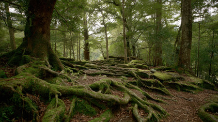 A captivating forest scene showcasing a network of exposed tree roots intertwined with lush greenery, creating a tranquil atmosphere with soft light shining through.
