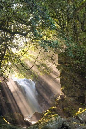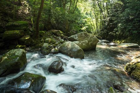 Stream of river along cedar trees in Yakushima island forest, Kagoshima Prefecture, Japan