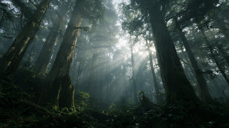 Thick green forest with tall old trees in Canada covering the streams of daylight