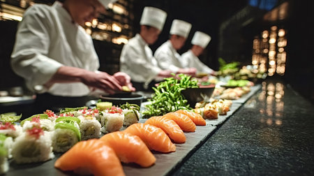 Skilled sushi chefs meticulously prepare traditional Japanese nigiri and maki rolls, showcasing professional craftsmanship in a high end restaurant kitchen with artfully arranged fresh ingredients