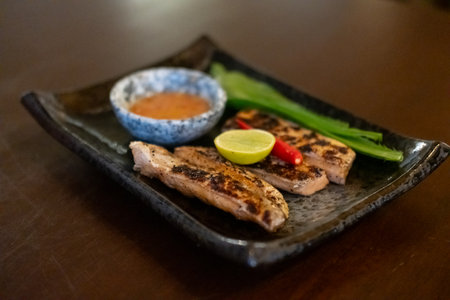 Salt grilled salmon set on the dining table in Japanese restaurant Bangkok Thailand