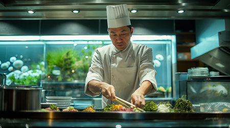 Chef is meticulously preparing gourmet dishes in a modern kitchen, showcasing culinary skills and attention to detail in a vibrant atmosphere.