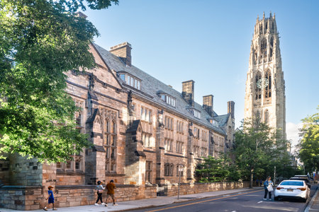 New Haven, Connecticut - June 8,2024: View of Ivy League Yale University Campus with historic architecture in view seen from downtown New Haven CT.