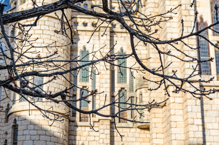 ASTORGA, SPAIN - MARCH 9, 2014: Facade detail of the neo-Gothic Episcopal Palace of Astorga, Castile and Leon, Spain. It was designed by the modernist architect Antoni Gaudi, built between 1889 and 1915