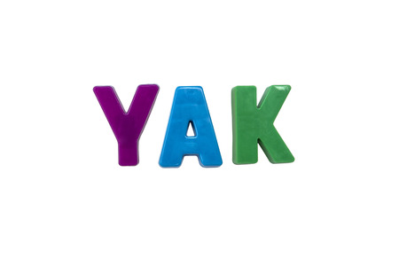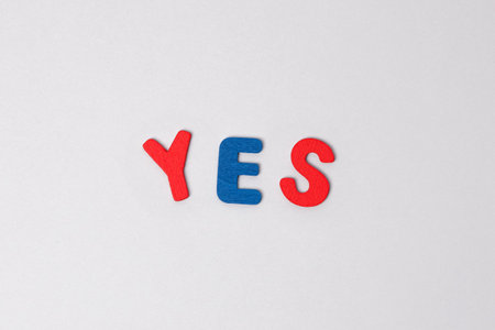 The word yes made of colored wooden letters on a light gray background. Blue and red letters form the word yes